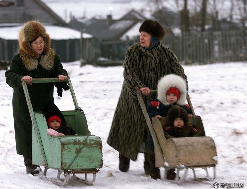 路透社跟著大人在風雪中忙碌移動的小朋友。
