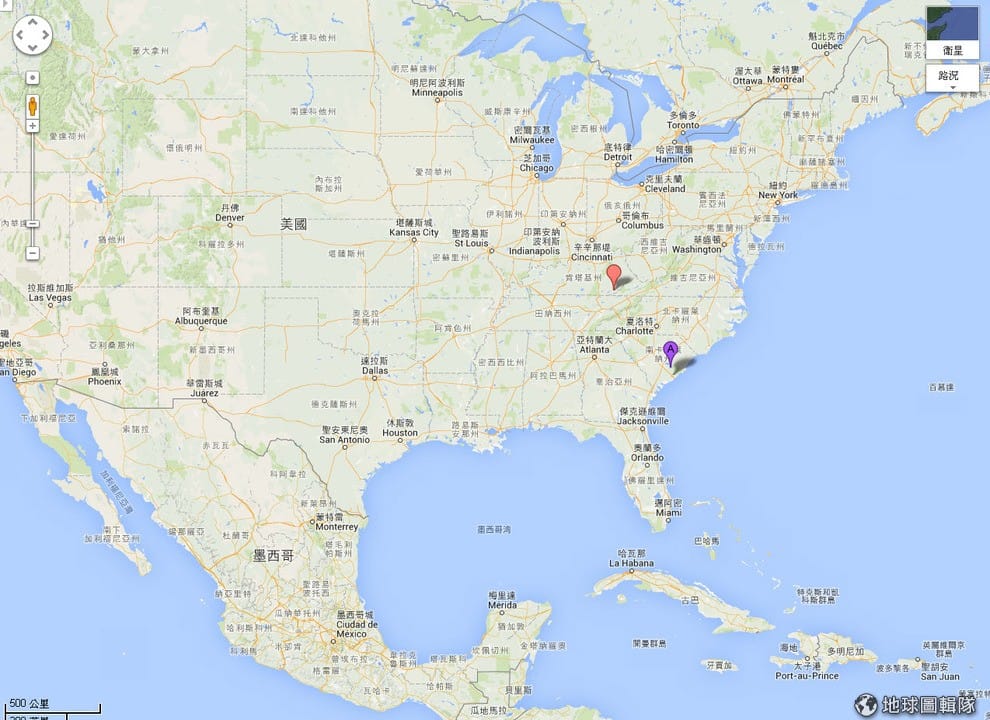 網友美東遇上低溫天候,這次用創意抵抗風雪的警察分別來自肯塔基州(紅色標記點)以及南卡羅來納州(紫色標記點)。