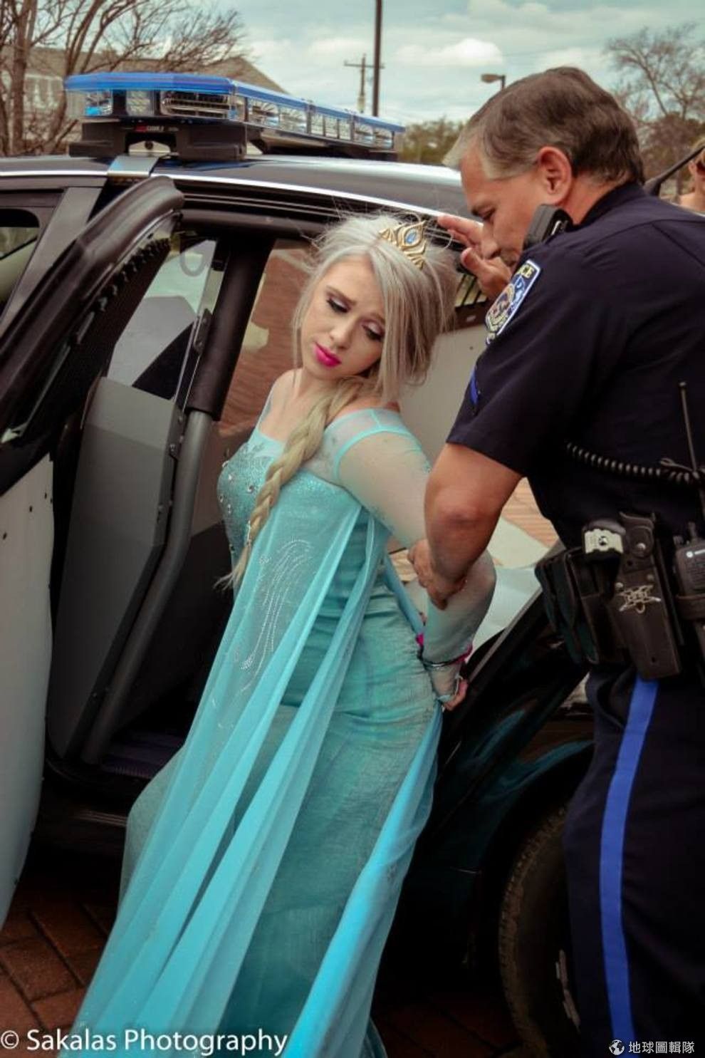 網友艾莎女王在員警戒護下前往警局。Photo credit: Sakalas Photography