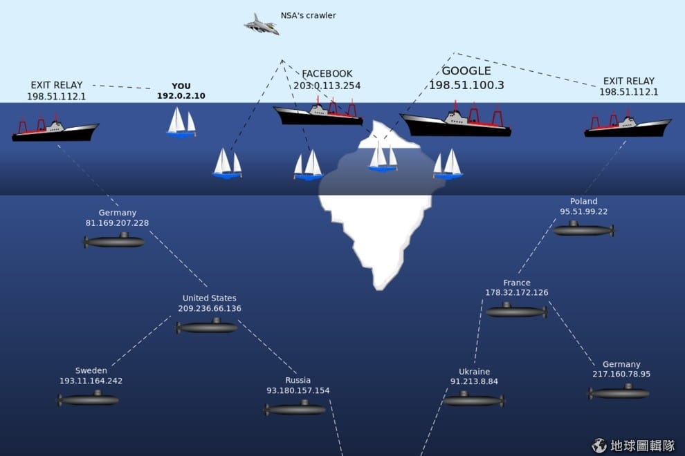 Tor畫出的暗網示意圖,我們常用的網路就像在海面上清晰可見的船,暗網就像是隱藏在廣大海水底下的潛水艇。Photo credit: Wikicommons