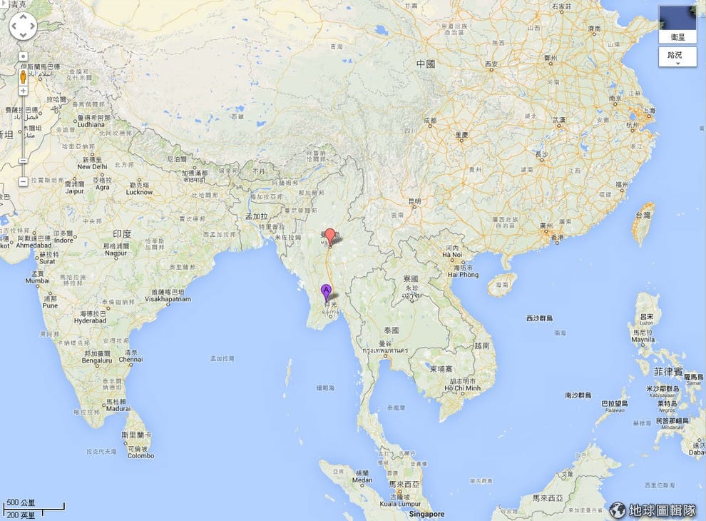 圖中的紅色標記點是 1月份就開始出現學生抗議行動的曼德勒,下方紫色標記點是緬甸警方阻擋學生繼續往仰光前進的禮柏坦市區所在地。
