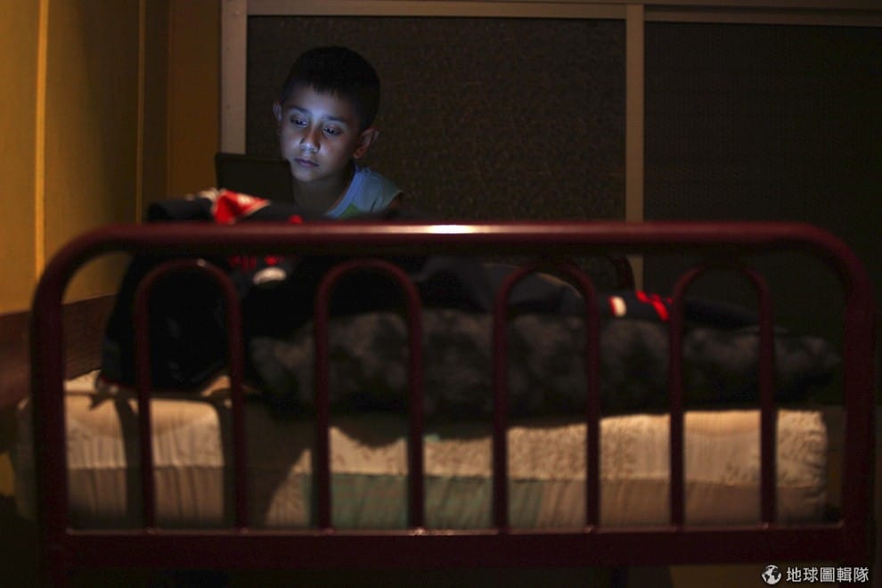 跟著指示緊急撤離的小朋友坐在避難所的床上。