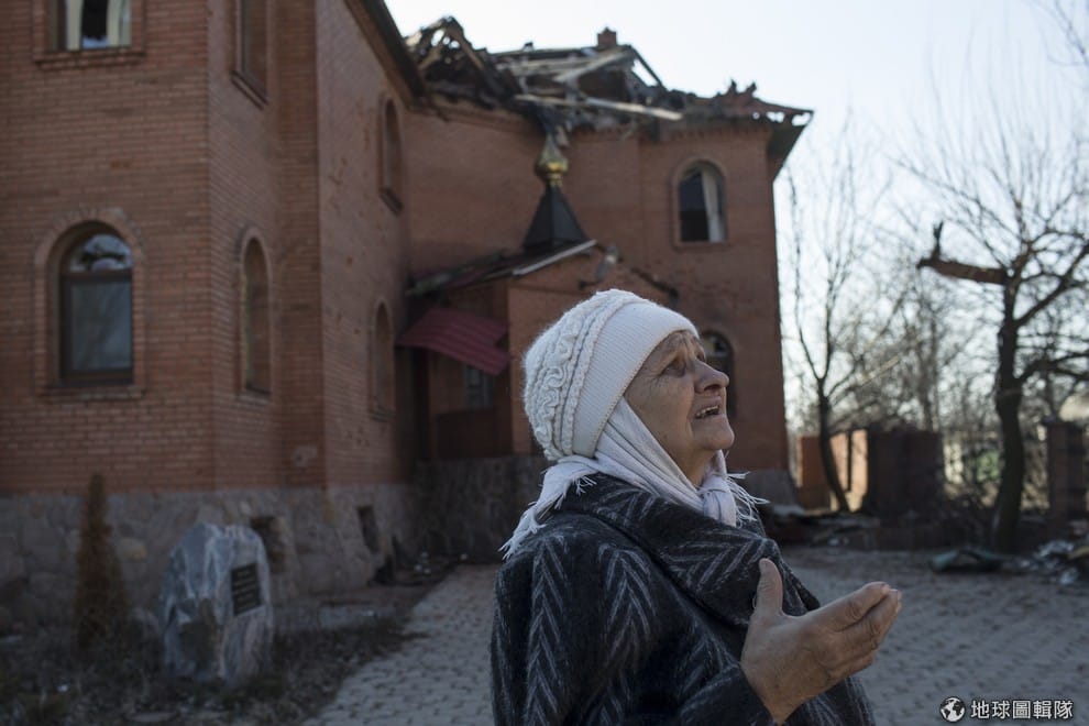 頓內次克當地,婦人看到被戰火波及的教堂忍不住難過。