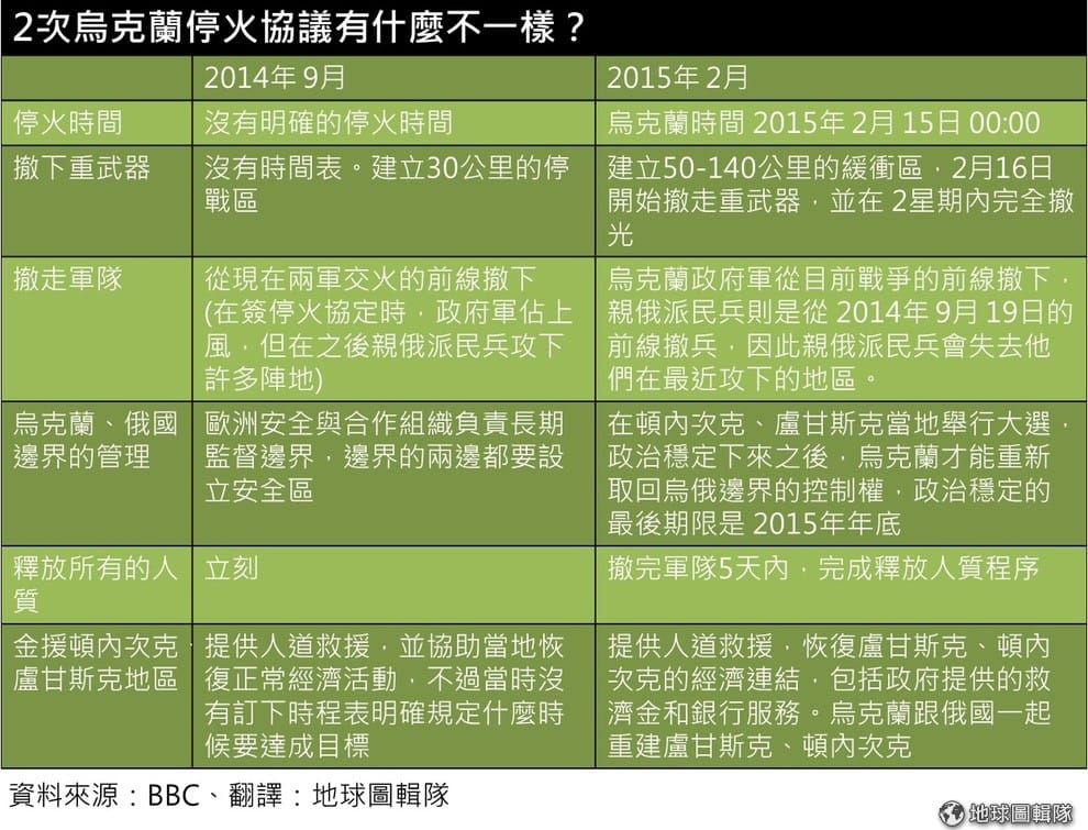 路透社烏克蘭危機發生以來,共有 2個停火協定,一個是在2014年 9月簽下,另一個則是在2015年的 2月。