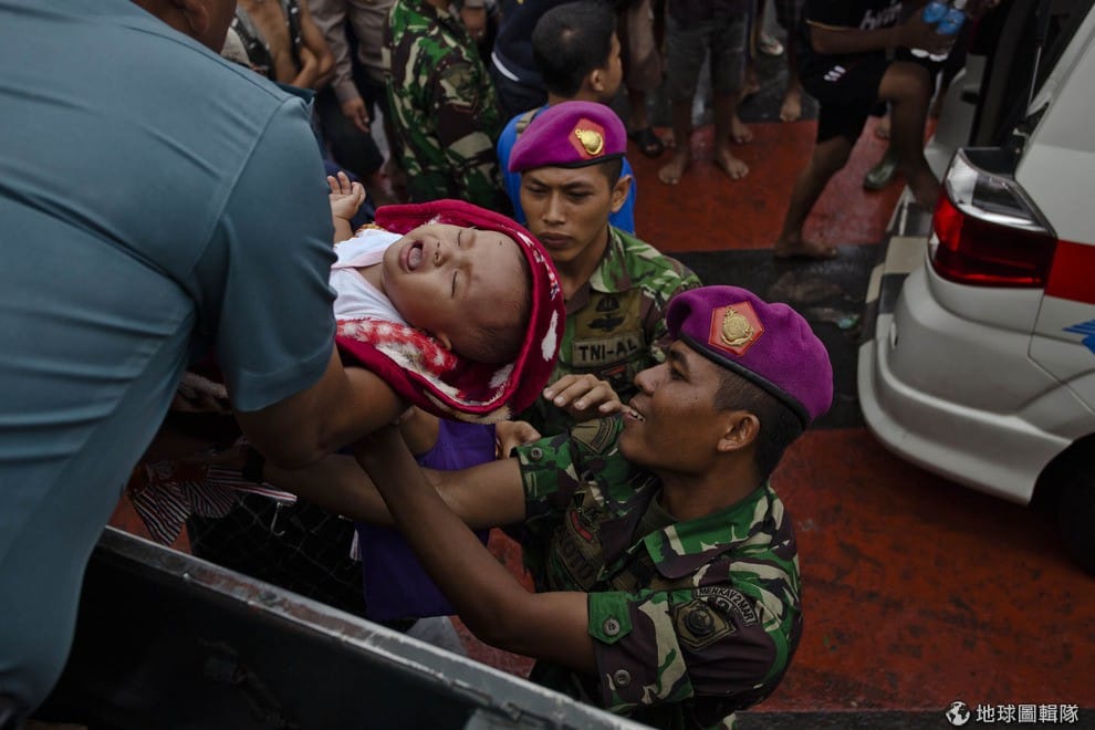 小貝比跟著家人一起撤離家園,當地的軍人也趕緊來抱住他。Ulet Ifansasti/Getty Images