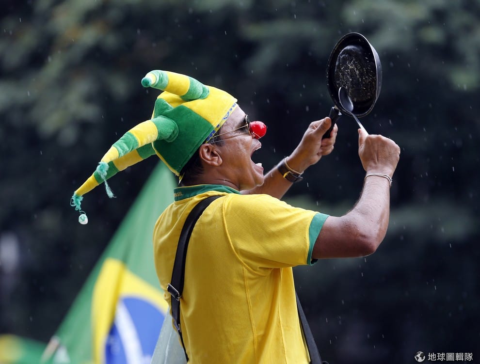 周日巴西警方估計,全國有超過百萬人在 60個城市抗議政府無能,要求彈劾總統羅賽夫。圖為一名抗議民眾敲打著平底鍋高喊口號。
