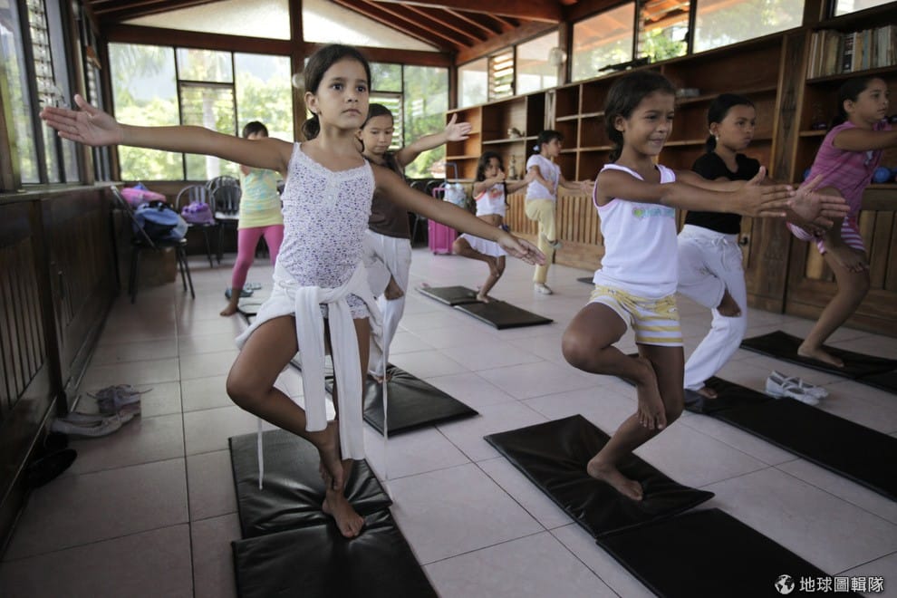 開始上課前,女孩子們在貼滿照片的牆壁前面站在一排。