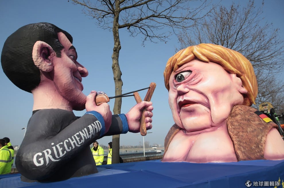 圖為德國嘉年華遊行中,象徵希臘(左)反對德國總理梅克爾(右)的花車模型。