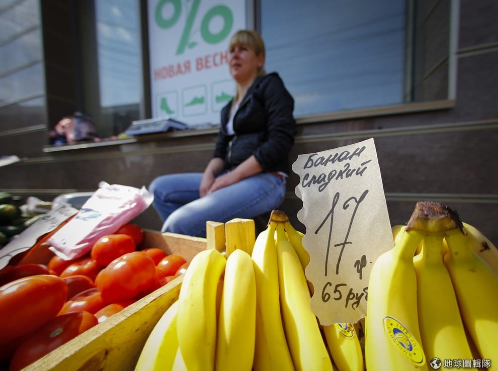 克里米亞當地的攤商,用俄國和烏克蘭的幣值寫出水果價格。