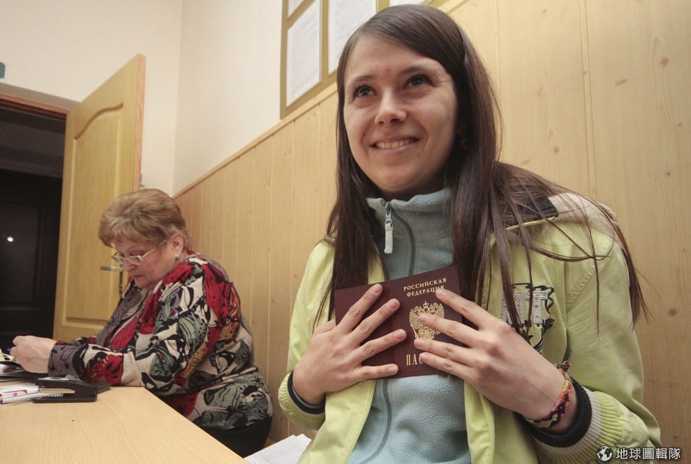 去年併入俄國後, 民眾開心地拿著剛拿到的俄國護照。