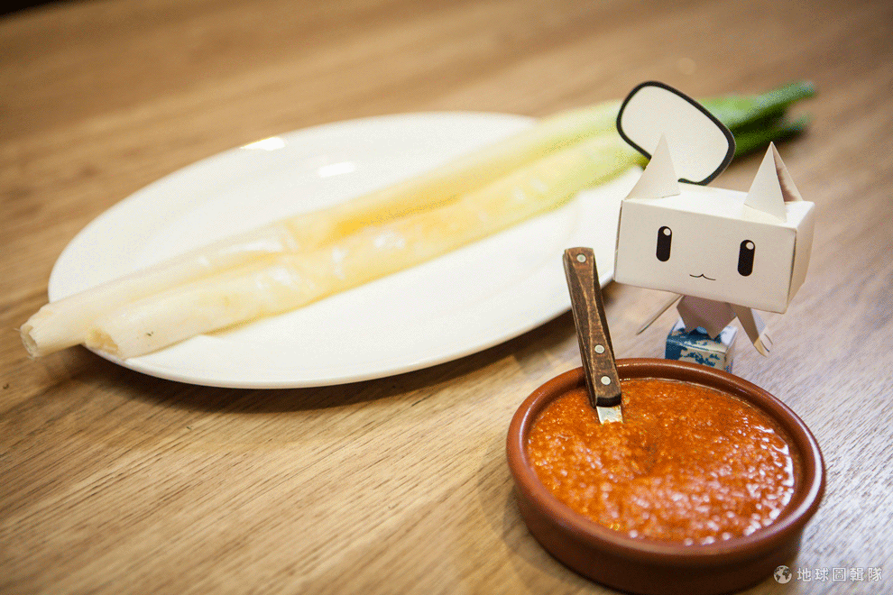 烤大蔥的必備良伴Romesco醬也起源於加泰隆尼亞地區。千萬別小看這一碟小小的Romesco醬,共需八種材料才能完成。首先,得先把蕃茄燙過去皮,壓成泥後加入糖、甜椒粉與辣椒粉。接著,把烤了 30分鐘成金黃色的杏仁片放入。此外,傳統上會放入大蒜,但為了避免生臭味,主廚將大蒜改成蒜酥,頓時有種濃濃的台灣味。最後將材料全部打勻,再加入雪莉醋與橄欖油提味,加泰隆尼亞Romesco醬就完成囉!