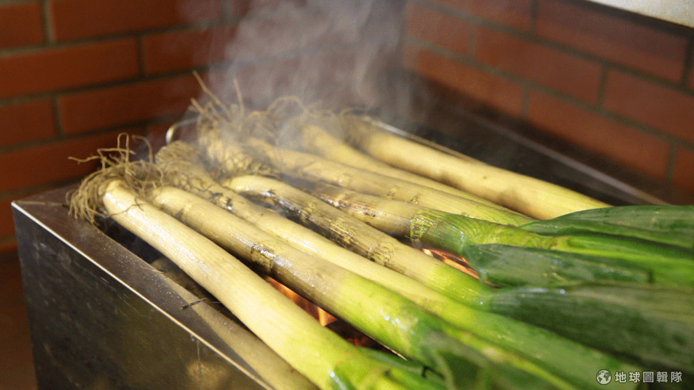 在爐子上大火快烤的大蔥,再過一會就可以一嚐香噴噴的美味囉!