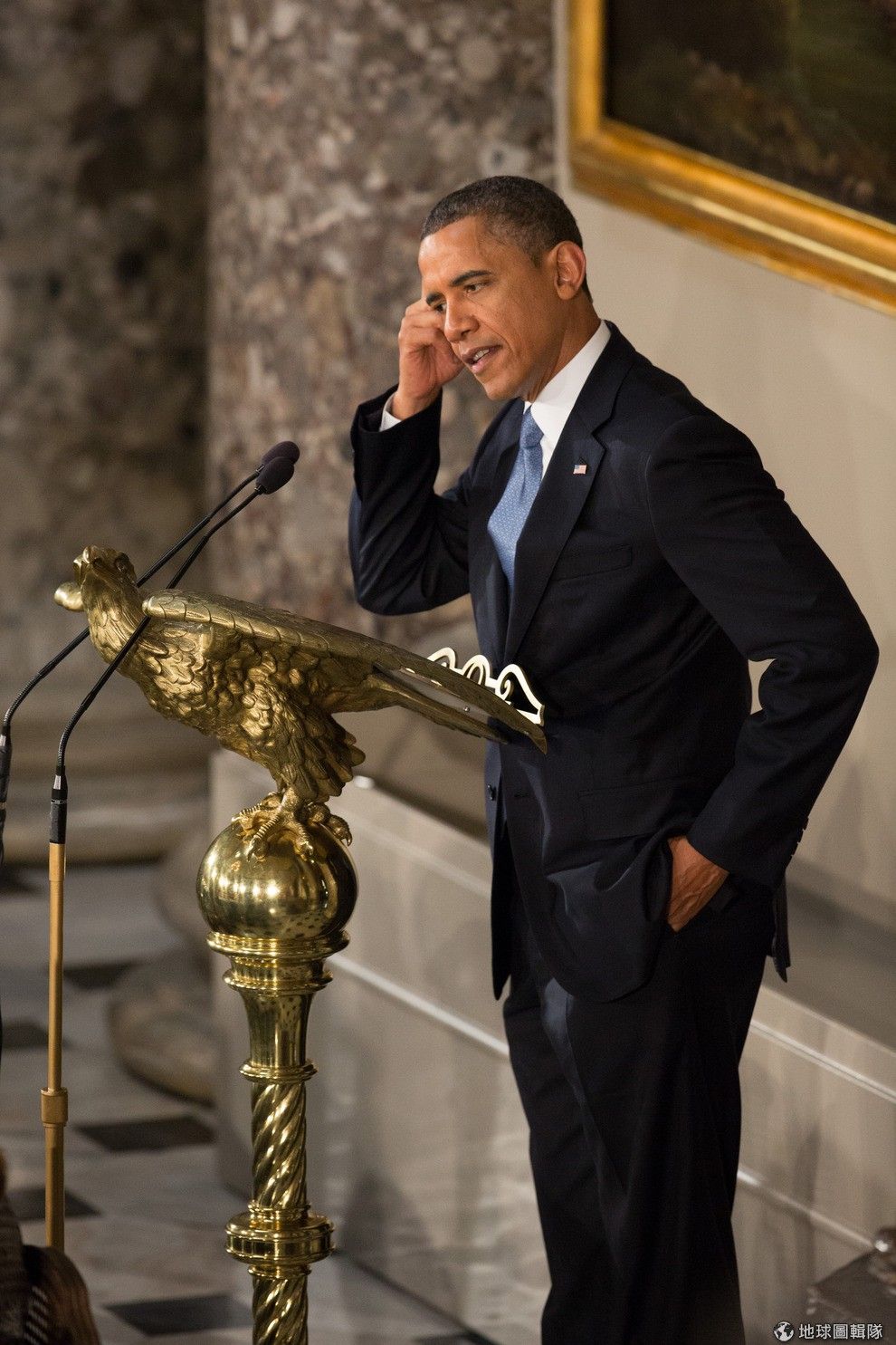 與大家致詞時,忍不住歪頭的歐巴馬。Allison Shelley/Getty Images