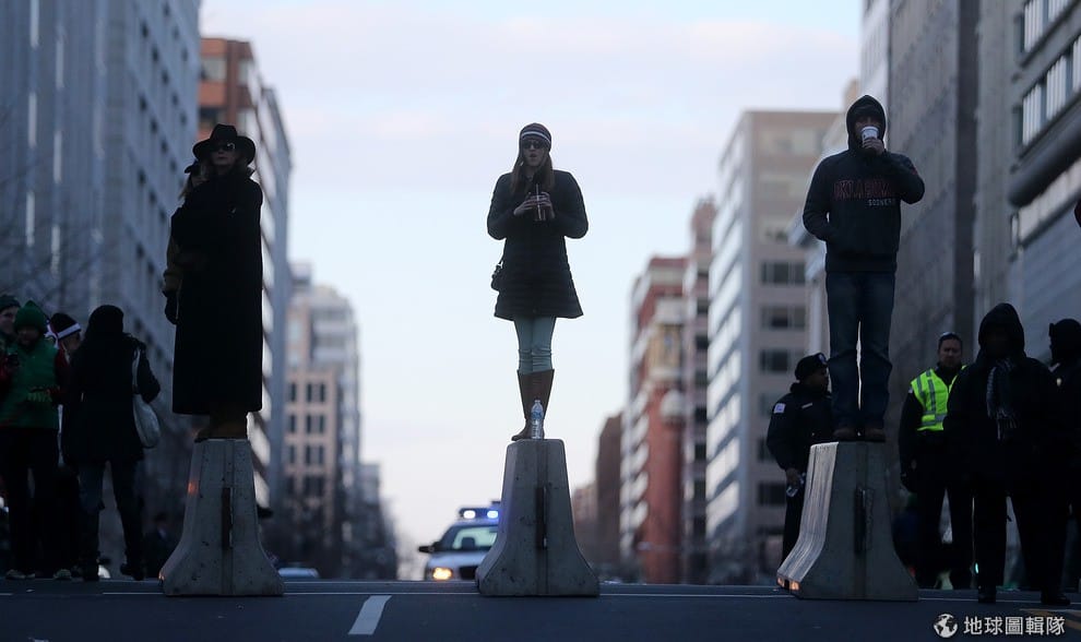 民眾站在路擋上,想佔得好位子,方便待會可以看到遊行隊伍。Mario Tama/Getty Images