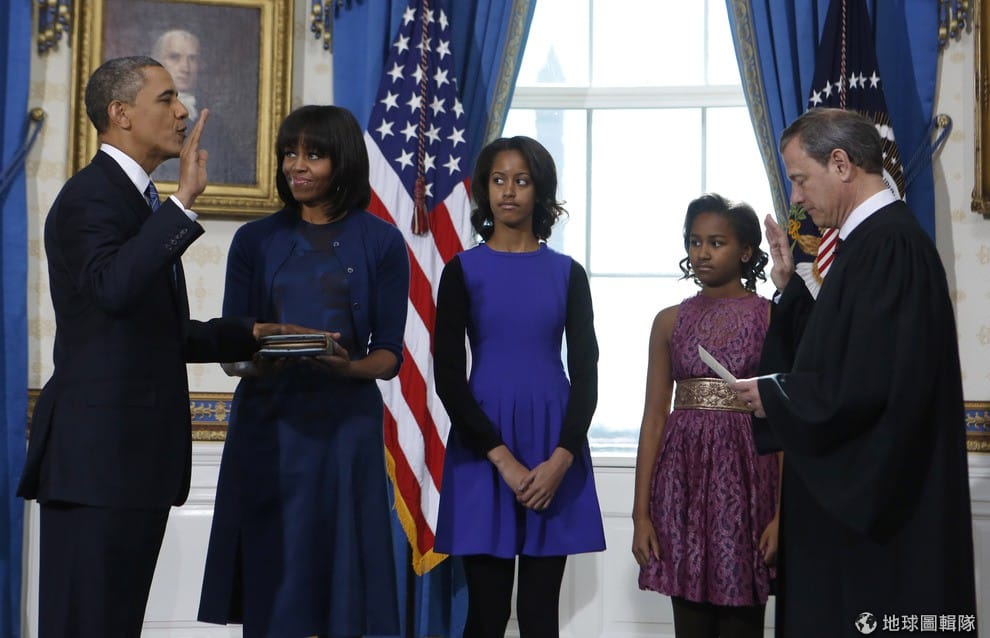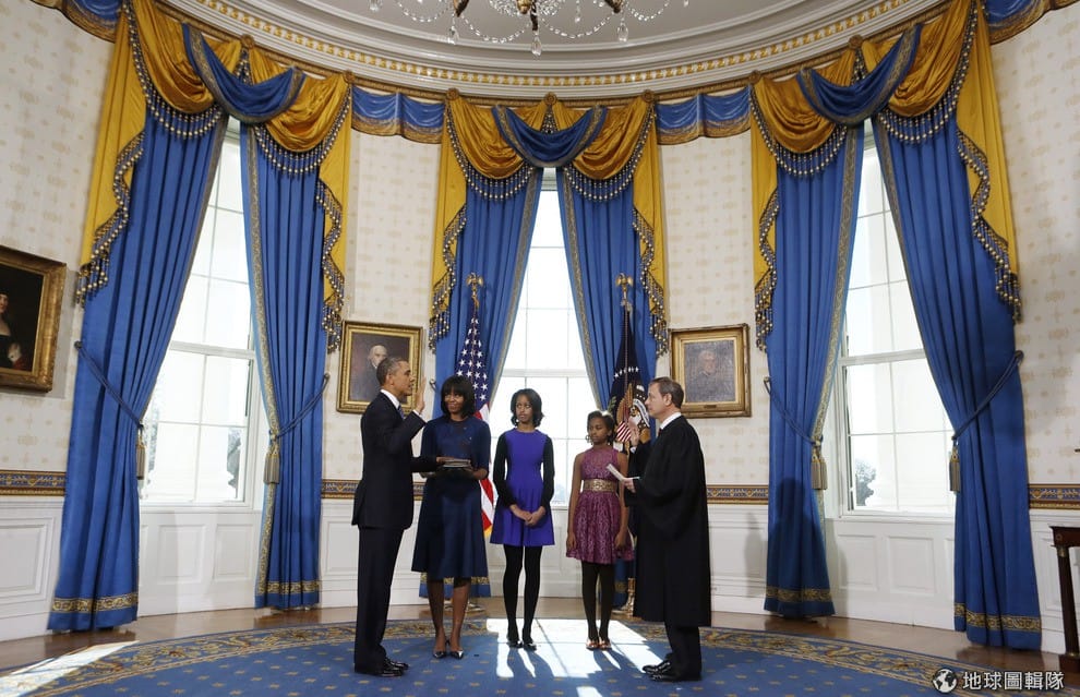 大法官、和妻兒的見證下,歐巴馬在白宮的「藍色之房」舉起手宣誓。Larry Downing-Pool/Getty Images