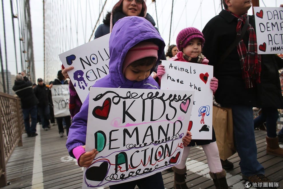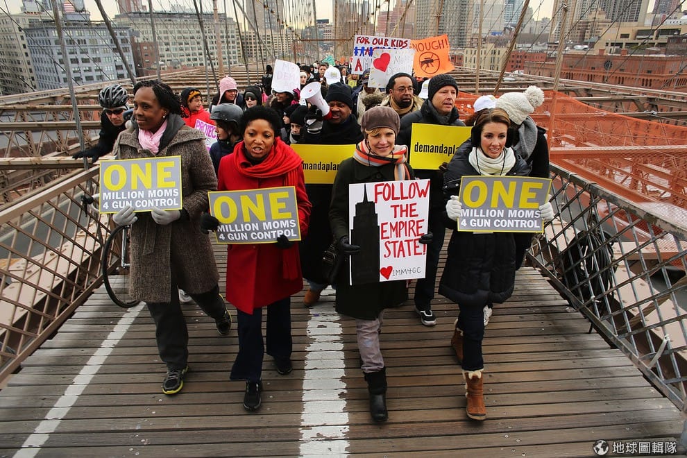 除了一般觀禮民眾外,場外也有許多要大眾注意的團體。例如反對擁槍的團體,他們正走上布魯克林大橋。Spencer Platt/Getty Images