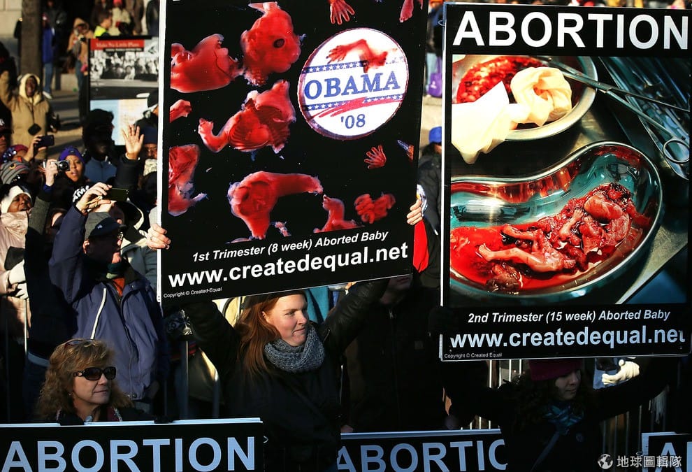 繼續閱讀 反對墮胎的團體拿著血淋淋的標語要吸引大眾關注。Alex Wong/Getty Images