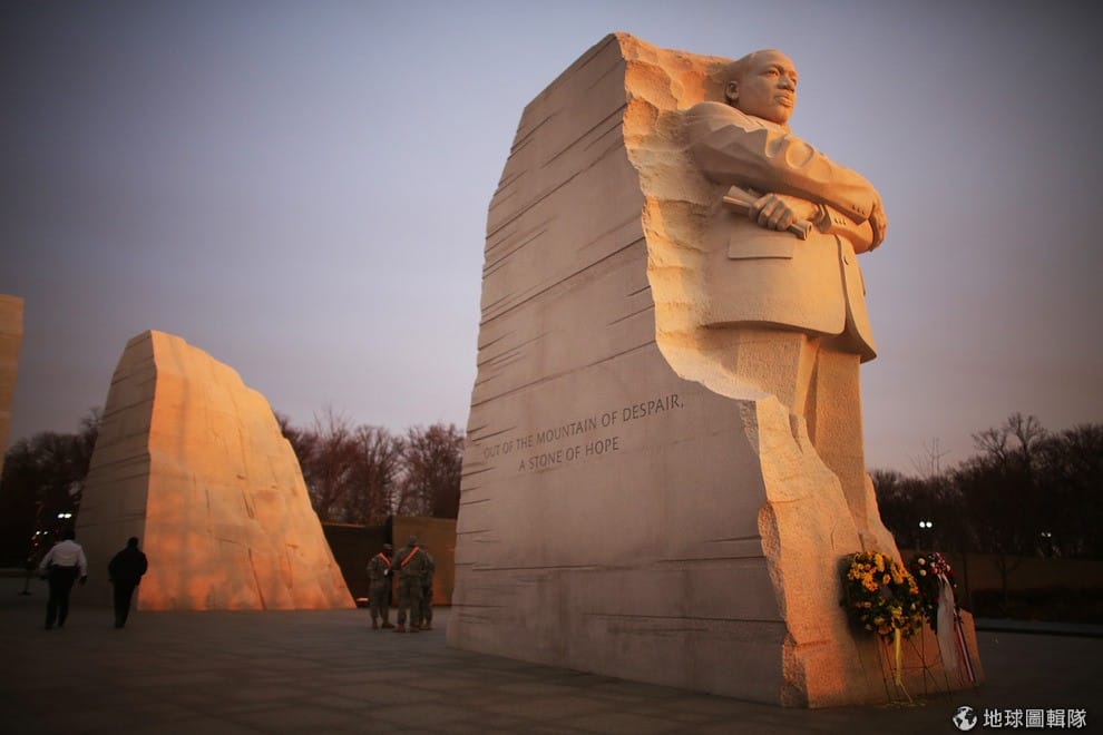 1/21這天,是很重要的日子,民權鬥士馬丁路德‧金恩博士的紀念日就是這一天。可以看到向他致意的花束擺在他的紀念雕像前。Mario Tama/Getty Images