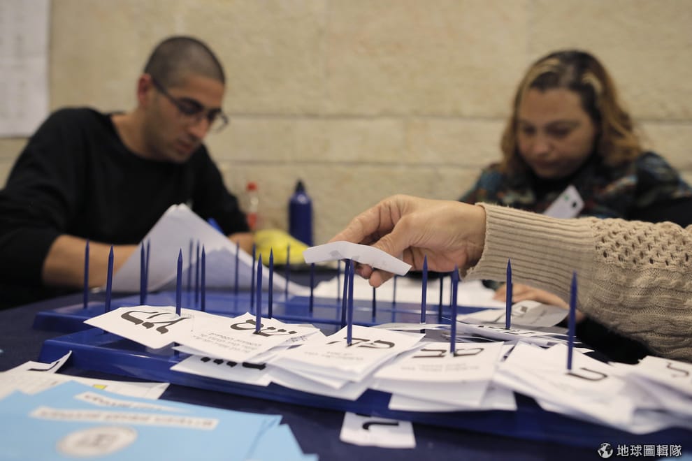 以色列在3月17日時舉行國會大選。納坦亞虎再度連任總理一職。照片中是選務人員正在計票。