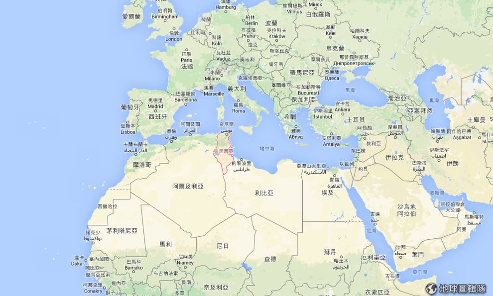 圖中紅色區塊即為北非的突尼西亞,2010年阿拉伯之春就是在這裡引爆。