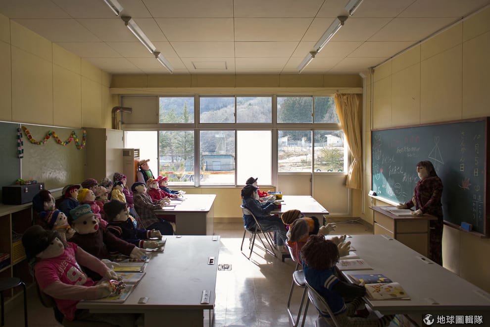 當年送走最後 2位小學生的校舍內已經空蕩蕩,取而代之的,是綾野手工製作的一具具稻草人,你可以看到它們化身成學生,有的坐在課桌前,有的站在走廊上,也有的稻草人成為黑板前的老師或是西裝畢挺的校長。