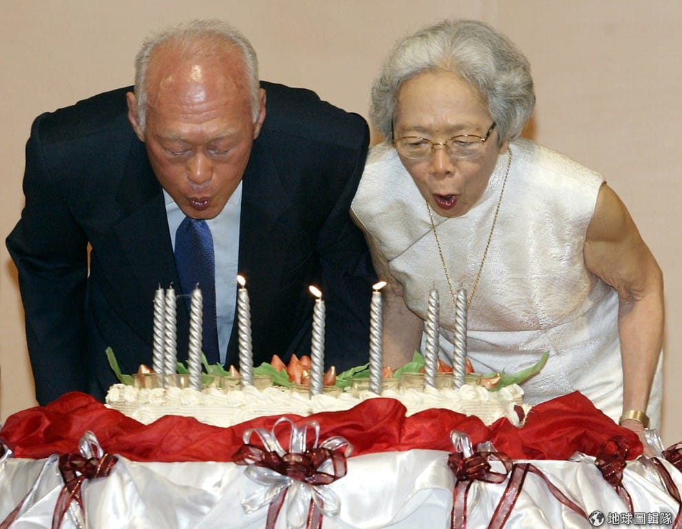 李光耀與妻子柯玉芝鶼鰈情深,圖為 2003年李光耀八十大壽時夫妻一起慶生。