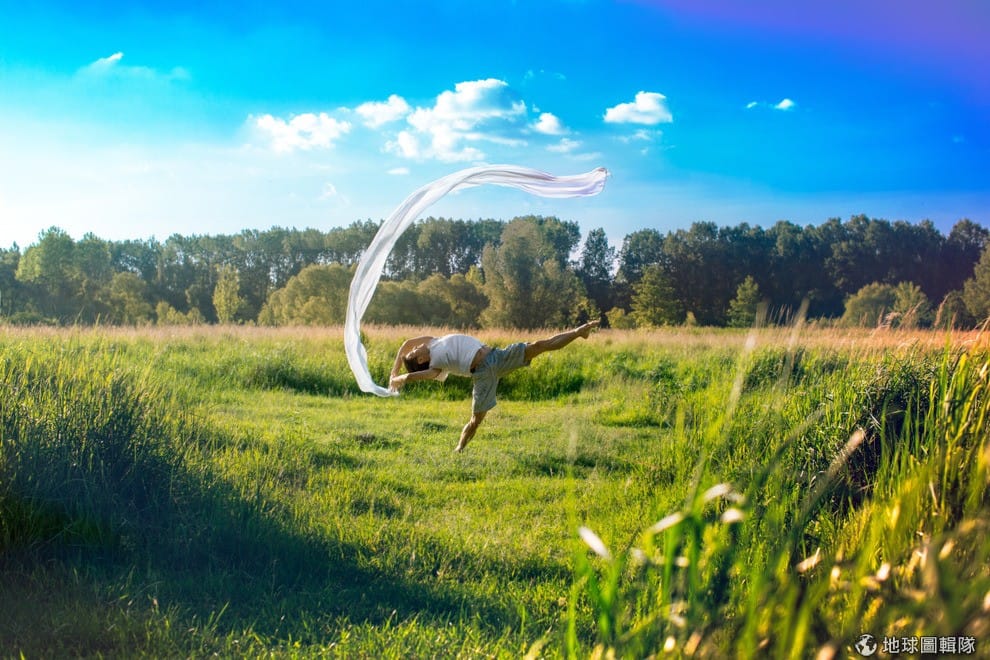 藍天、白雲,周楷的舞姿和大自然之美融合在一起。Photo credit: 周楷