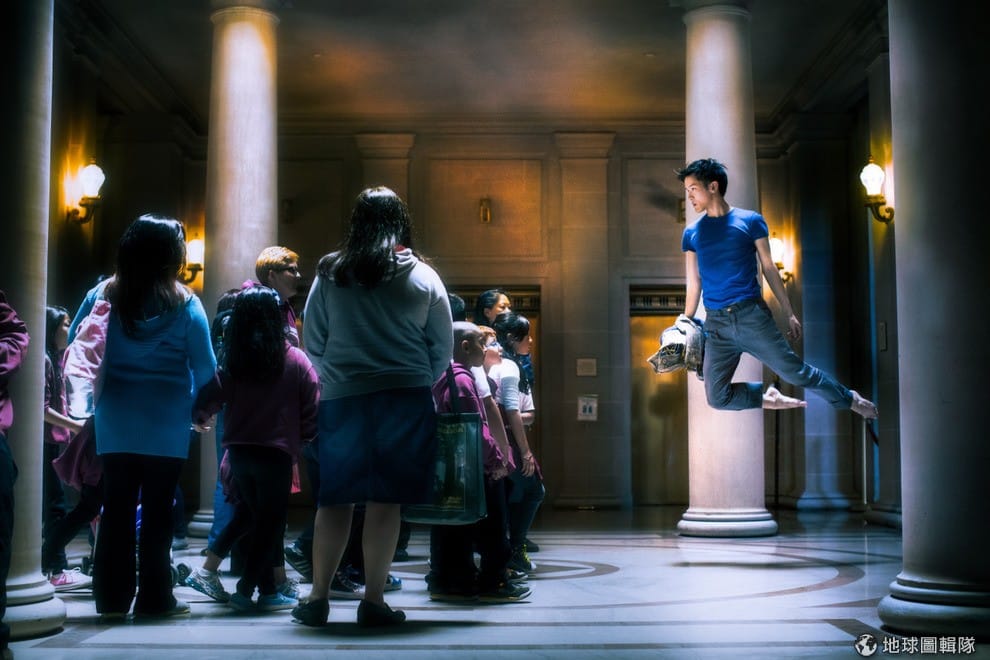網友一群小朋友與周楷在博物館中面面相覷,畫面宛如靜止一般。Photo credit: 周楷