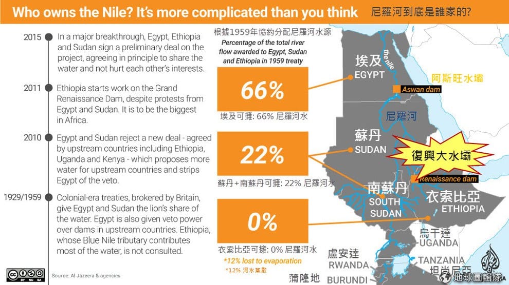 3月中開始,尼羅河的水權爭議不斷成為新聞焦點,埃及不滿衣索比亞因為要建大水壩,把青尼羅河的河流改道,這會影響到下游埃及的水源供給,另外,尼羅河流經的蘇丹,也對衣索比亞要蓋水壩一事感到憂心,一直到日前 24號時, 3國領導人齊聚簽署協定,尼羅河的水權爭議才開始出現曙光。