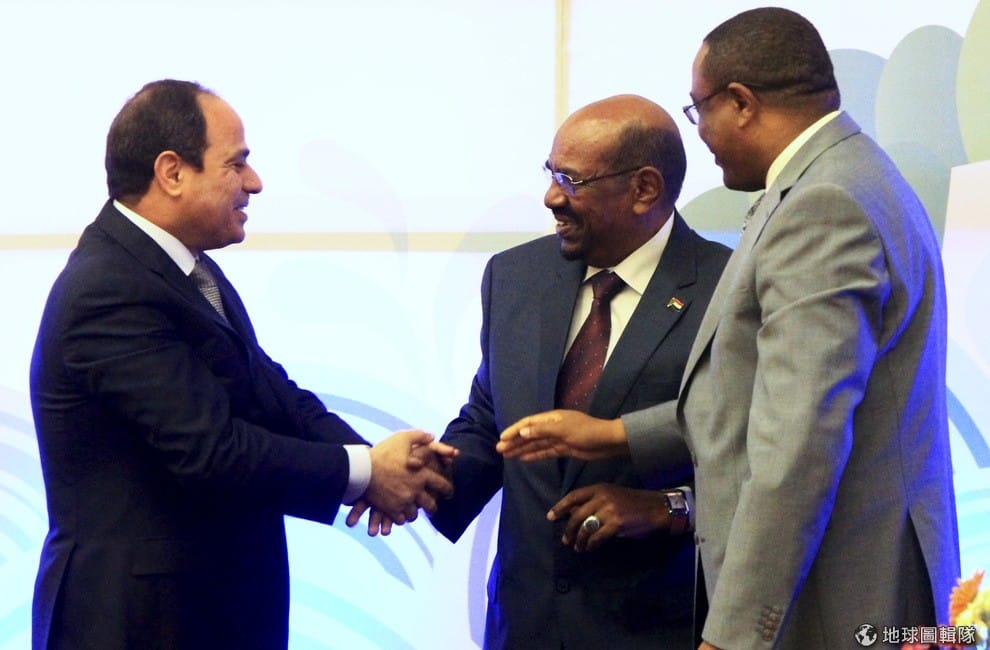 24號時,埃及總統塞西(左)、蘇丹領袖巴希爾和衣索比亞總統德薩萊尼(右)一起簽署重要的水權協議。