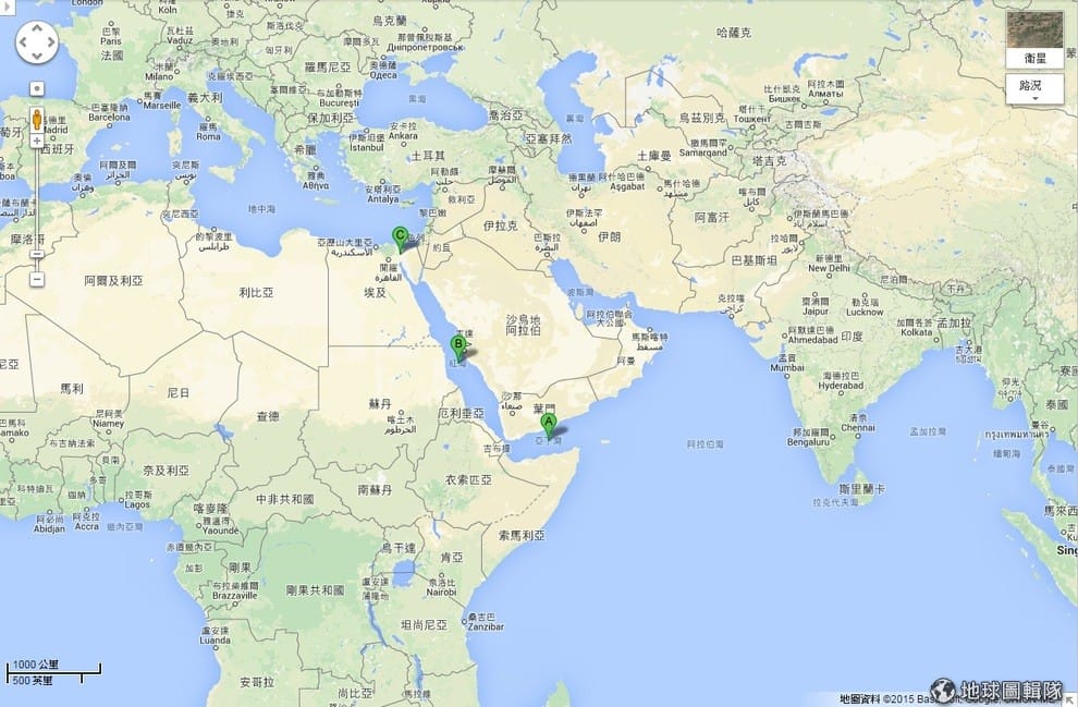 阿拉伯國家要運石油到歐洲,得先經過葉門旁邊的亞丁灣(A點),再到紅海(B點),經過蘇伊士運河(C點)最後才能到歐洲。