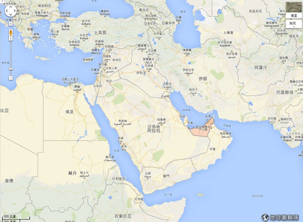阿拉伯聯合大公國位在圖中紅色劃記處。