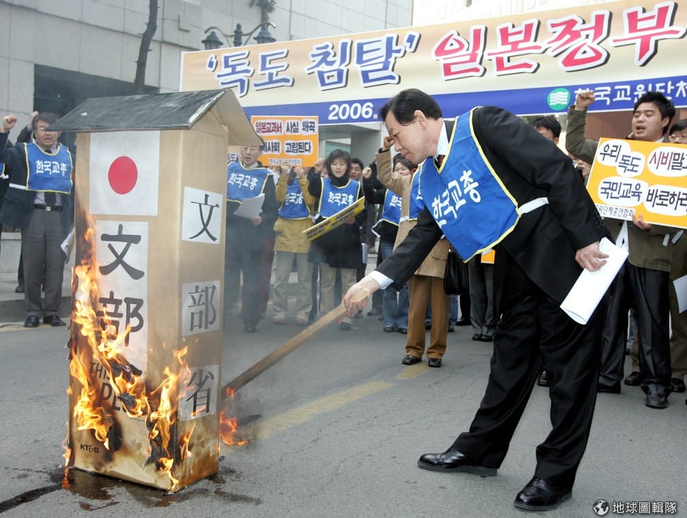 南韓不滿日本修改教科書,淡化二次世界大戰時對慰安婦的作為憤而燃燒貼有日本文部省標誌的道具。