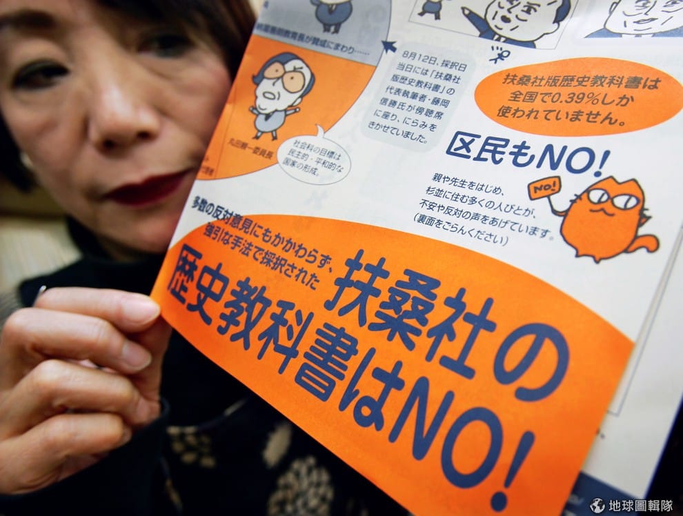 2005年時,日本杉並區的居民發起抗議教科書粉飾史實的行動,圖片中的民眾拿著拒買扶桑社出版教科書的標語。