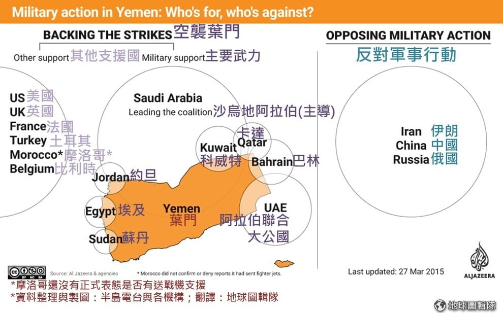 葉門戰爭已經持續一陣子,3月的時候,以沙烏地阿拉伯為首的聯合軍隊開始空襲葉門,幫助葉門總統哈迪一派。美國也在這星期表示會送武器給阿拉伯聯軍。沙國表示胡西組織背後有伊朗撐腰,但伊朗卻說他們並沒有支持胡西組織。
