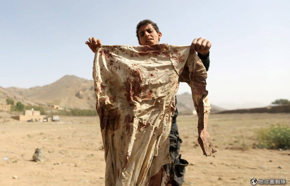 葉門的村莊遭到空襲,空襲地點的少年手上拿著沾血的衣服給攝影師看。這場空襲造成至少 3名女性以及3個小孩死亡。