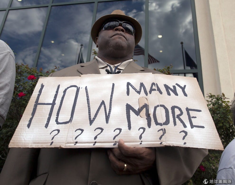 再度有黑人被白人警察射殺引發民眾怒火,照片中民眾舉著標語:「還要再犧牲多少人???????」