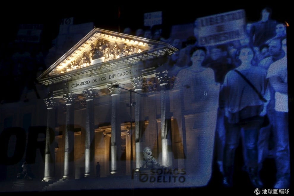 人民不滿西班牙政府公布的新公民安全法,批評者又戲稱其為「窒息法」。此法將在 7月1日生效,限制人民抗議的權利,比如不准拍下警察的照片,也不准和平抗議政府當局,更不准在國會前集體示威,違者有可能被處高達 3萬歐元(折台幣約 100萬6,200元)的罰鍰。