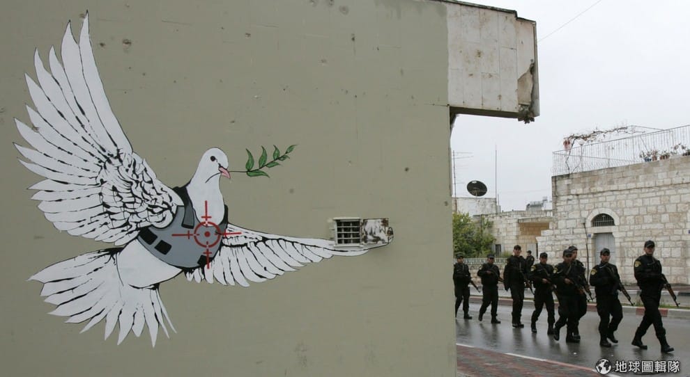 班克斯在加薩留下一幅幅塗鴉。圖為穿著防彈背心的和平鴿,背後剛好有一群武裝警察走過。