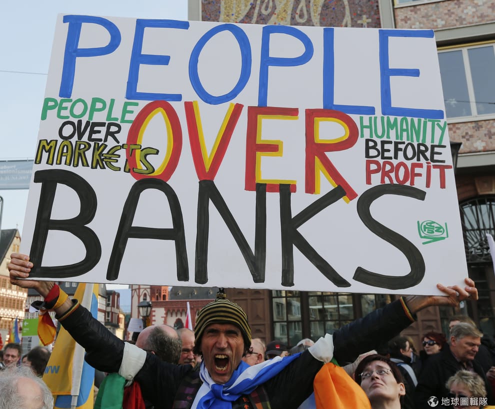 抗議民眾手持寫著「人民在銀行之上」的標語,在新落成的歐洲央行總部旁抗議。