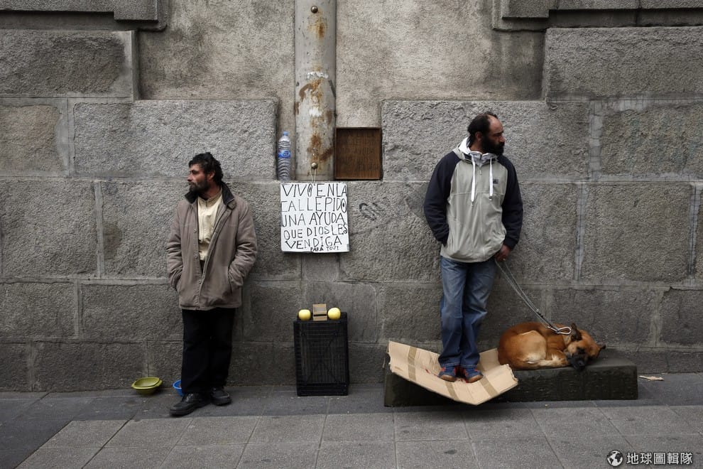 南歐國家的街頭仍可以見到不少無家可歸的人。圖中央的白色牌子寫道:「我在街頭流浪請幫幫我,願神祝福你們。」