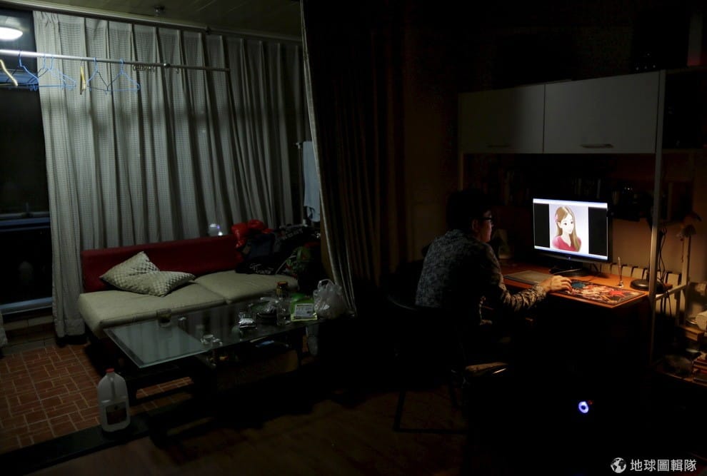 路透社迷戀網路主播的王東在房間內看著主播的卡通照。
