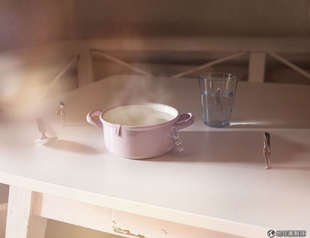 畫面中的小人有不少都是阿欽的朋友,在這張照片中,湯鍋與水杯都成了游泳池。Photo credit: Manuel Archain
