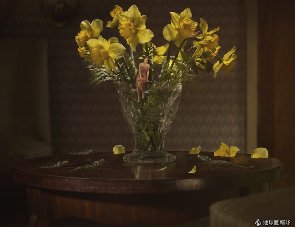 在談到一個女子睡在盤中這張照片時,阿欽說:「我想呈現的正是我們要如何區分夢中世界與現實?她在睡覺嗎?我們是不是也是夢裡的一部分呢?」