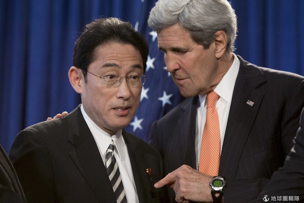圖為美國國務卿凱瑞(圖右)與日本外務大臣岸田文雄(圖左)在會議上互動。