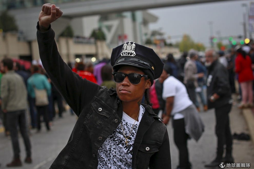 從上週末開始,巴爾的摩因為黑人遭警施暴致死陷入混亂,圖為參加抗議的示威者。