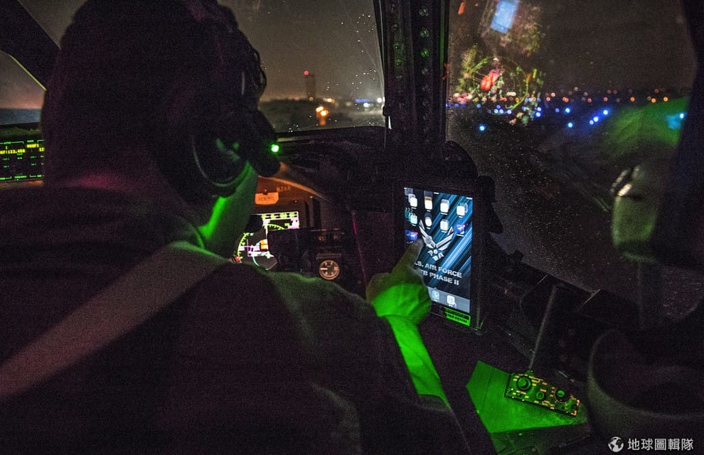 起飛前,駕駛員用iPad的電子飛行袋系統,閱讀飛行計畫。Photo credit: 349th Air Mobility Wing
