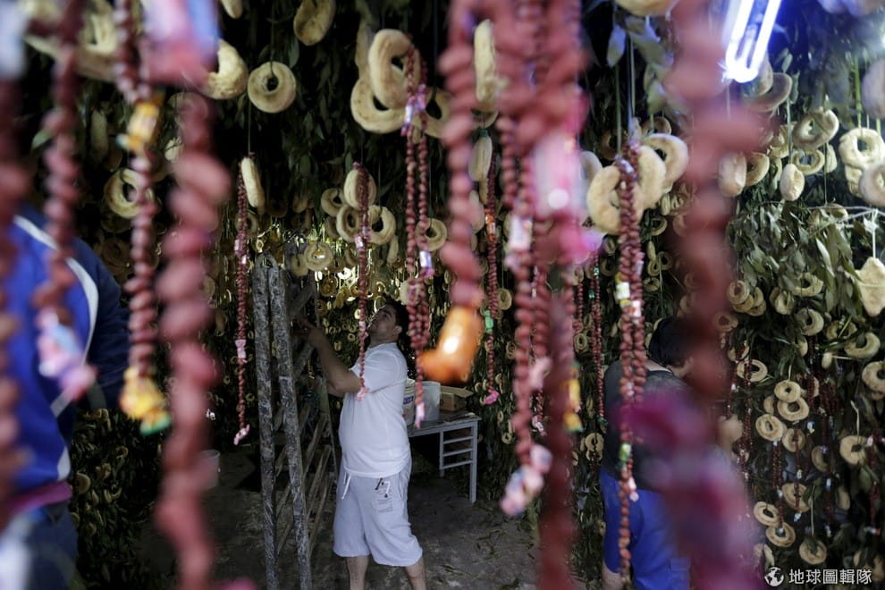 路透社安塔爾家人們忙進忙出,穿梭在成串吊掛起的奇巴麵包串中。
