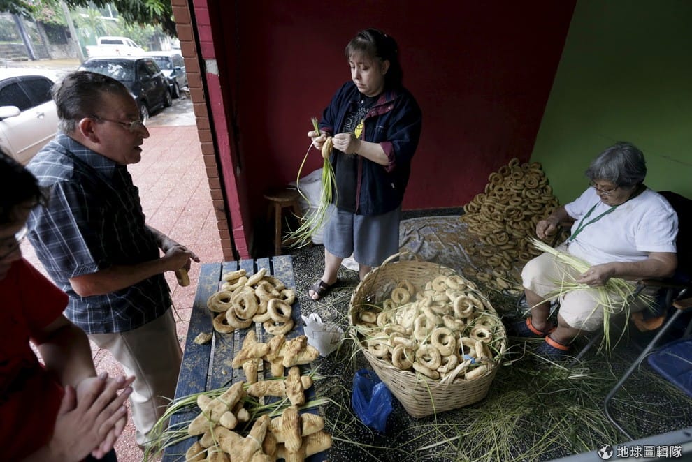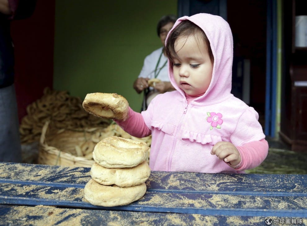 5月3日這天,巴拉圭的安塔爾家全員動員,他們忙著把 3000多個奇巴麵包裝飾到聖壇上,就連家族的小妹妹也來幫忙。