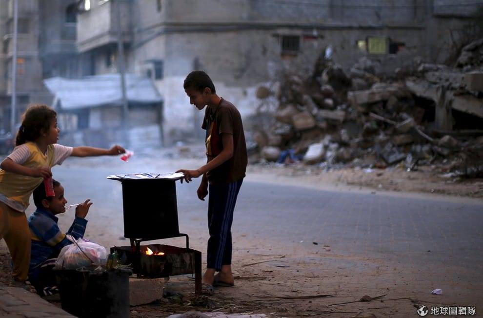 加薩走廊在 2014年夏季的衝突中被破壞殆盡,圖為圍在爐火旁吃零食的孩子們,他們身後的建築物在當時的衝突中被摧毀。